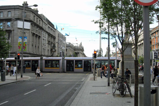 Below we see one of the 301 trams in Abbey Street as it crosses O’Connell Street. This is on the Red line but we are unable to identify the tram. What we can see, however, is that the tram remains in its original three section configuration.