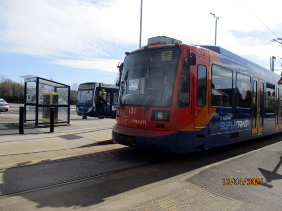 Closer to the camera is a more familiar sight on these pages, Stagecoach Supertram 121 which stands at Middlewood terminus also waiting to depart for its next journey, in this case to Meadowhall.