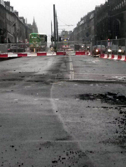 This first photo shows the view from the top of Leith Walk looking north towards Leith where the road surface has been removed. The new track extends from Leith up to the low level red and white barrier. In the foreground are some of the sets which would have formed part of the paving for the first generation trams on Leith Walk.