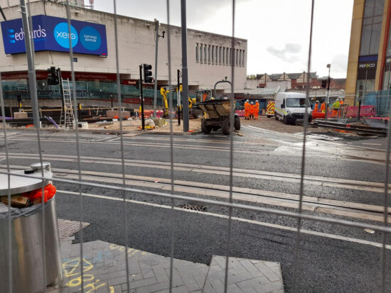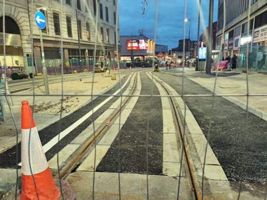 Looking up Bull Street where the final layer of tarmac has now gone down around the tracks and is being flattened on the right. As can be seen here further finishing works are still required surrounding the tracks.