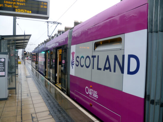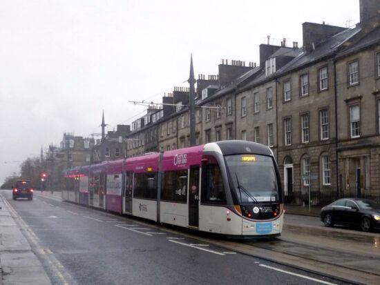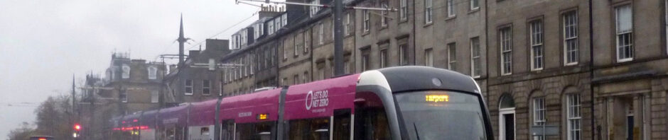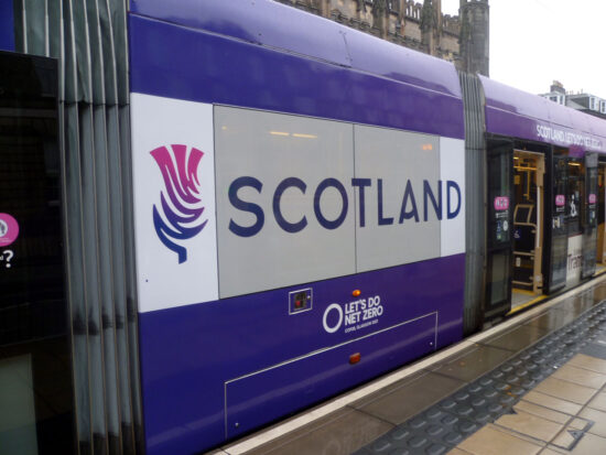 Replacing adverts for Edinburgh Napier University – only added in July 2021 – this advert uses the slogan “Scotland. Let’s do net zero” and the colours of the vinyls graduate from blue through purple to pink. As usual its full height adverts on the third and fifth sections and above window ads on the other sections of the tram. 269 retains its masks below the cab window too.