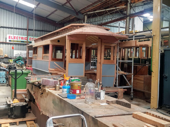 The first view is in the workshops and shows Ballarat 12 under restoration. Originally built in 1892 it was initially a cable car trailer on the North Sydney line of the New South Wales Government Tramways it was purchased by the Electric Supply Company of Victoria Ltd in 1905 and rebuilt as a California combination car. Conversion to one man operation came in 1913 and it was then withdrawn in 1935 and sold on for an alternative use. It was rescued in 1990 and is now under restoration as seen in the below photo with the body now mostly complete.