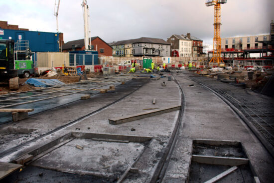 We take it all back! What a difference a few days make in Blackpool! After what had seemed to be slow progress over the past few months (years?) on the constructions works in connection with the tramway extension up Talbot Road to Blackpool North Railway Station the first week of November has seen a major change with plenty of work on the overhead now completed with the concreting around the tracks on the old Wilko’s site also seeing good progress too. These photos come from Friday 5th November.