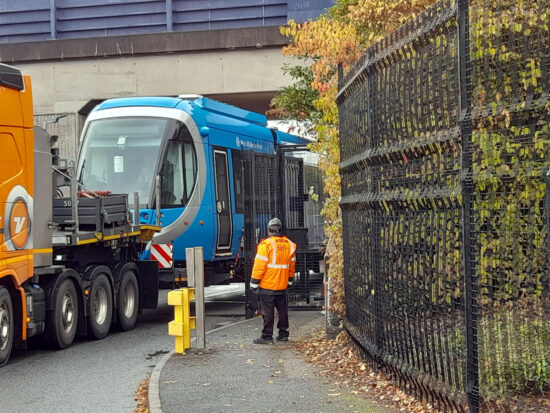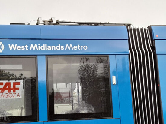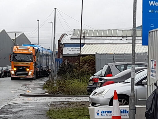Wednesday 10th November saw the eighth – and for now final – Urbos100 tram delivered to West Midlands Metro’s Wednesbury Depot with 45 arriving on the back of a low loader at approximately 1120. The tram made the trip from CAF’s plant in Zaragoza, Spain entering the UK at Bristol before making the final leg of its journey via road.
