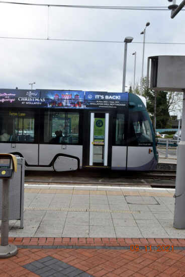 With Christmas around about six weeks away (yes, really!) a new advertising campaign has recently been launched to publicise Christmas events at Wollaton Hall in Nottingham. Starting on 28th November and running through until 9th January 2022, there will be a trail of light and music for visitors to see including a Christmas Market. The standard advertising style on Nottingham Express Transit is followed with no full vinyl wraps having been seen since the latest refurbishment of the trams.