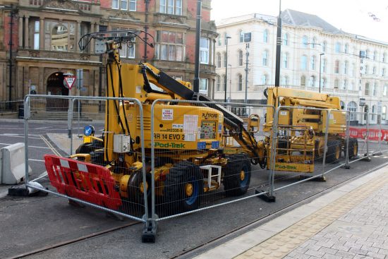 The Blackpool Tramway extension along Talbot Road to Blackpool North Railway Station is now at a stage where although there is work continuing to take place its not obviously apparent as a lot of it is checking of overhead alignments and the like. To aid this work one of Pod-Trak cherry pickers has now been fitted with a pantograph.