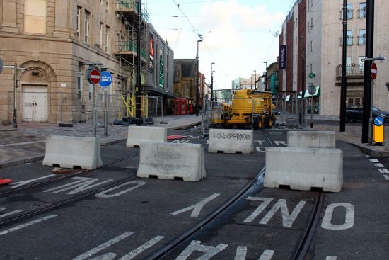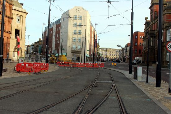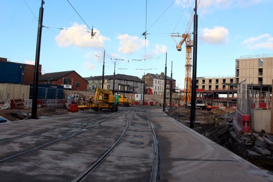 As we saw last week the overhead was strung along the length of Talbot Road and up to Wilko’s with that in Talbot Square itself having been completed back in July/August. The next phase of the work now seems to be checking the alignment of the wires before any trams are allowed anywhere near the extension. These checks have been taking place on the curve between Talbot Square and Talbot Road with both tracks now having had this work.