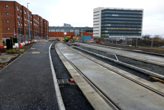 • Completed track installation across Bernard / Baltic Street junction with The Shore tram stop works in progress.