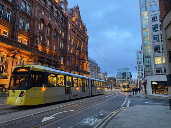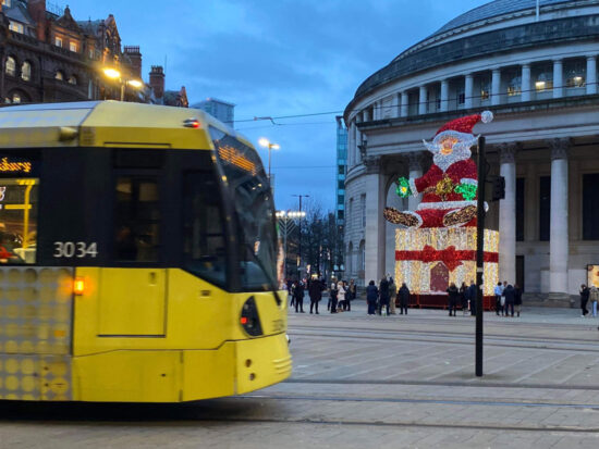 In this edition of “Out and About” we get all festive as we take a look at trams running in Manchester City Centre with a very large Father Christmas overlooking things!