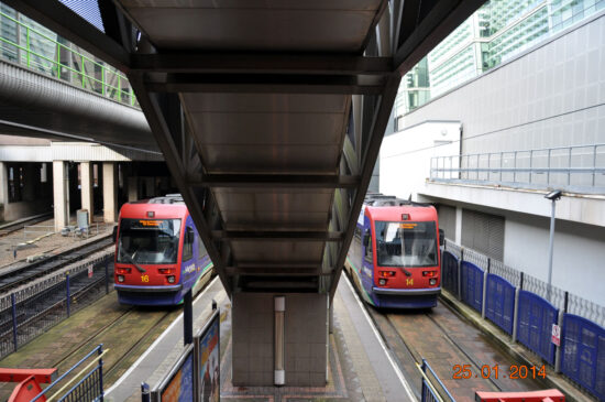 This photo was taken on 25th January 2014 and perfectly frames two of the T69 trams awaiting departure north to Wolverhampton St George’s. 16 – the last T69 to be left in Birmingham – is on the left and 14 on the right. The escalators leading from concourse to platform level nicely split the trams and the railway tracks into and out of Snow Hill can be seen the other side of 16.