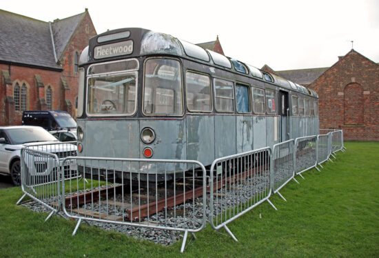 August 2021 saw a Blackpool tram go to school with orphaned Twin Car Trailer 687 (T7 in old money) acquired by Rossall School and moved there from Wyre Dock where it had been stored under the ownership of the Fleetwood Heritage Leisure Trust. In a pre-arranged visit on 24th November 2021 British Trams Online reader Gareth Taylor was able to capture images of the tram in its new surrounds.
