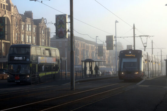 Sunday 19th December 2021 was a foggy day on the Fylde Coast and proving that it doesn’t have to be sunny to take tram photos this latest edition of “Out and About” takes a look – just about! – of some Flexity2s running through the fog in Blackpool.