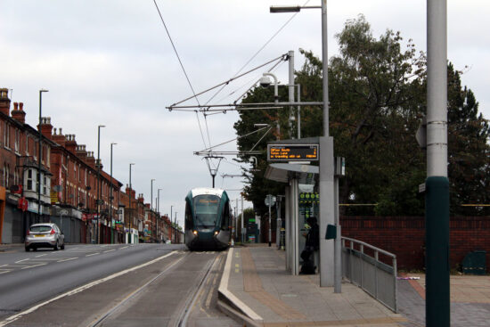 It’s a fairly straightforward description for the route between the stops at Radford Road and Hyson Green Market as the tram just continues along Radford Road! We are still sharing the road with other traffic so there can be delays but we will reach Hyson Green Market which has a single side platform on the left hand side with all the usual accompaniments. After departing from this stop the line turns left into Terrace Street and after we reach the end of that road its back onto Noel Street and we then start the approach down to The Forest.