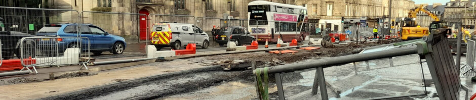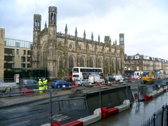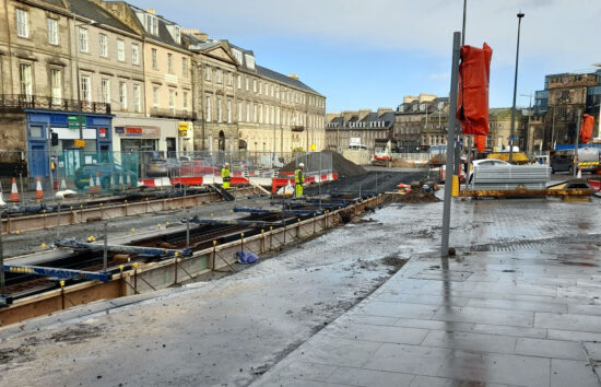 Meanwhile, a little further onto the extension and the first track is now being laid in Picardy Place. This will, of course, be the location of the first new stop on the line which will also replace that at York Place for this area.