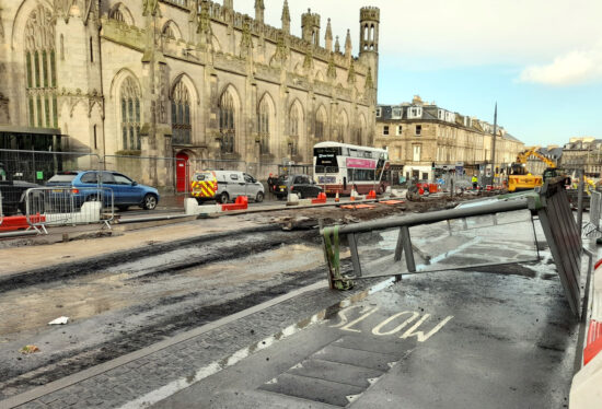 They say a week is a long-time in politics and that also seems to be the case in tram extension construction! Less than a week after the stop at York Place was permanently closed in Edinburgh much of the platform has already been removed with the shelter unceremoniously dumped at the side of the work compound whilst track laying is also continuing within Picardy Place.