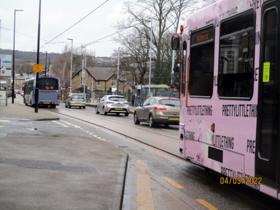 The bus broke down at around 1300 – a Wright Streetlife bus operated by First, fleet number 63008 – and was stuck blocking the tram line for about four hours. During the blockage 111 was trapped the wrong side of the bus and had to remain there until the bus was cleared. Services on the Yellow route were diverted to Malin Bridge throughout the disruption.