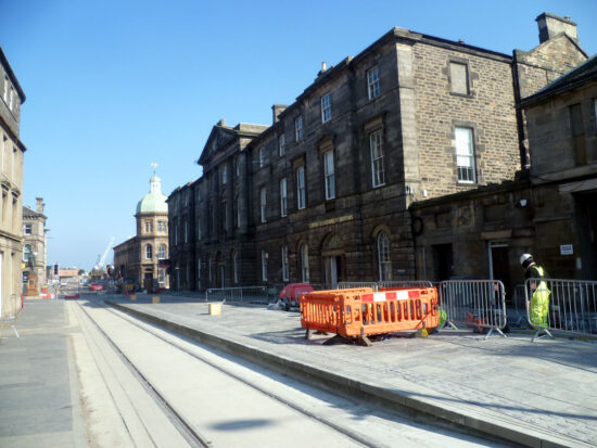 Looking north across the Bernard Street/Baltic Street junction with the Robert Burns statue just visible on the far left hand side this photo shows The Shore tramstop. The building with the green dome is the former Corn Exchange which was built in 1862. (Photograph by Roy Calderwood, 8th March 2022)