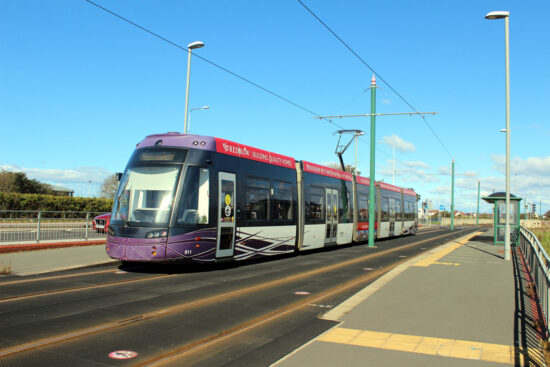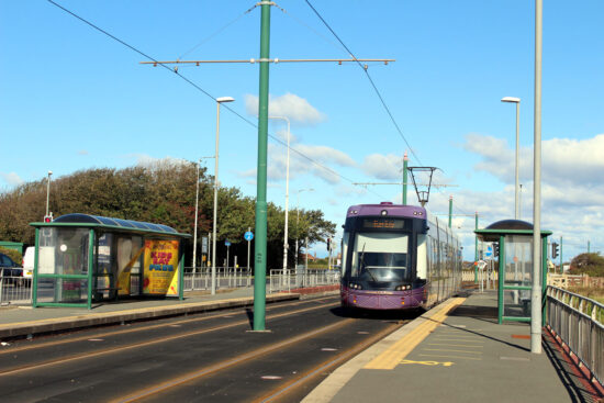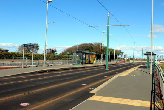 Our journey starts to get a little bit rural as we depart from Rossall Beach heading north to Rossall School. The road to the left changes from Rossall Road to Broadway and on the right we now have fields and you may get sight of some horses minding their own business before a tram comes whizzing by! We then arrive at Rossall School tramstop which has everything we have come to expect from the tramstops on the Blackpool Tramway – shelters (on both platforms), lighting, signage and information panels.