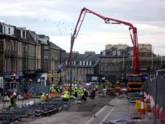 This is the York Place/Broughton Street junction on Wednesday 9th March. The eastern end of the York Place platform would once have been in the foreground but has now all gone. A concrete pour is underway at the road intersection just beyond the former tram terminus. The tracks have now been laid across the road junction towards the Picardy Place tramstop site, which is beyond the first set of traffic lights.