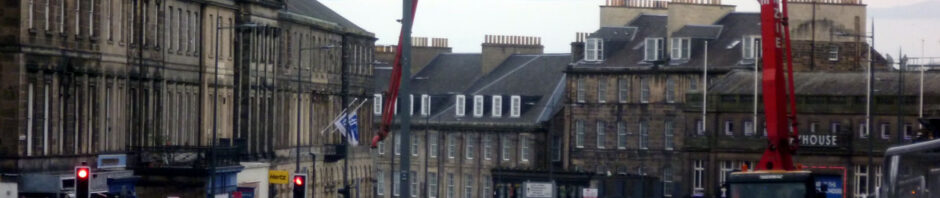Five days after the previous photo and this is the site of Picardy Place stop taken from a passing bus. This looks due west and although the rails have now crossed over the York Place/Broughton Street intersection (just this side of the church), the ground is still being prepared at the tramstop with various holes in the ground. The Conan Doyle pub is the black painted corner building (centre left) – the former York Place stop was just beyond that. (Both Photographs by Roy Calderwood)