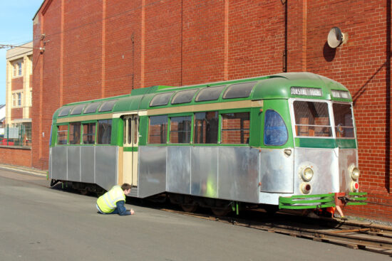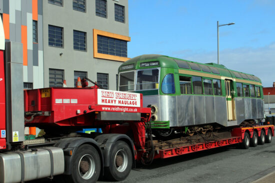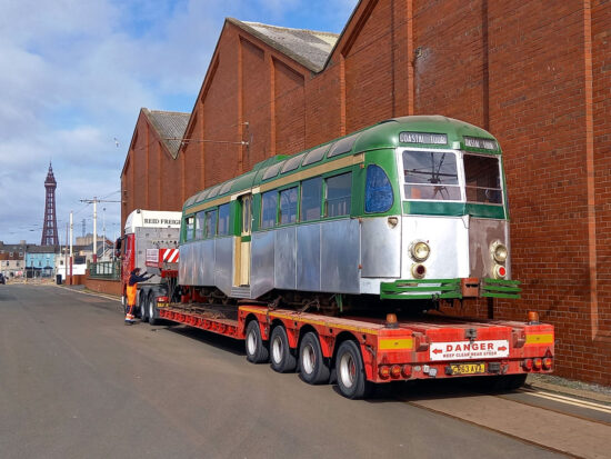 Rigby Road Depot is home to a “pointy ended” English Electric Railcoach once more with the Fylde Transport Trust’s 279 having made the short trip across Blackpool on Thursday 17th March 2022 to allow for the last stages of its restoration to take place. The tram had been away from Rigby Road since 2018 during which time excellent progress has been made on its restoration by the FTT but it has now reached the stage where any further work needs to be undertaken at Rigby Road which is what will happen in the coming months.