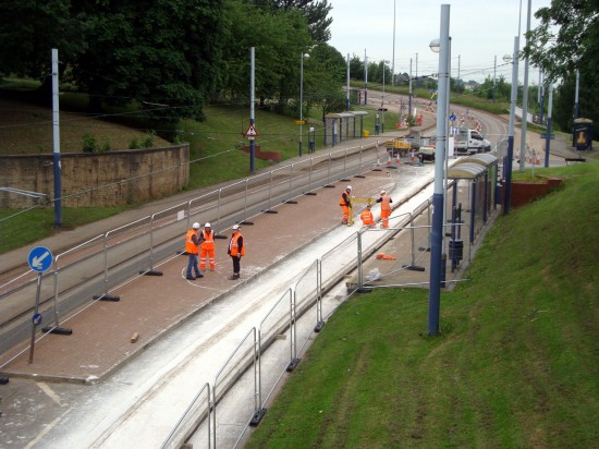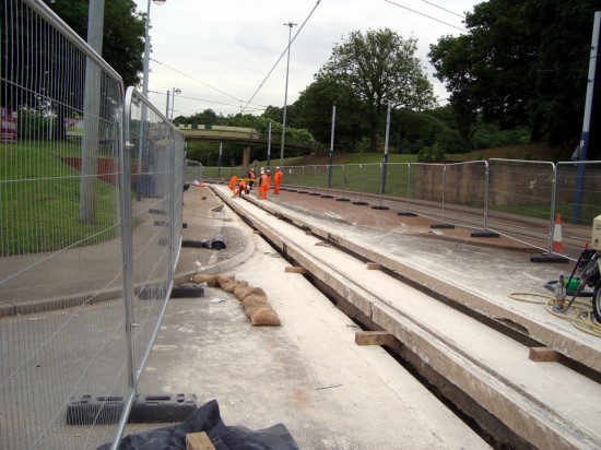 The much talked about trackwork on the Stagecoach Supertram network has now commenced with the section of tramway between Spring Lane and Sheffield Tramway closed as from Sunday 30 June to allow a 12 week period of track relaying. The first day of the closure actually saw no work take place but as from Monday 1 July the workmen were on site to start the replacement of the track near Park Grange tramstop.