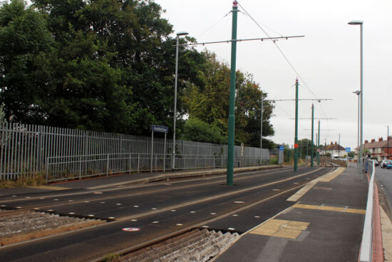Our journey continues northbound and after we depart from the previous stop at Broadwater we soon cross over Fleetwood Road and with local shops either side of the tramway then have a closed section of tram only route before we come out again with roads either side of the tracks. Radcliffe Road is on the left and Copse Road on the right with industrial premises further to the right, including a yard where Blackpool Jubilee 761 was temporarily stored for a time. We then arrive at Heathfield Road which is shelter free but has information panels and lighting with centre poles to support the overhead.