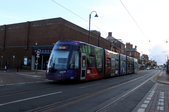We leave Fisherman’s Walk heading north and with a crossover provided here for any short-running trams we then join Lord Street for that on-street running, sharing with other road vehicles. For many years between the closure of Glasgow’s tramways and the opening of Manchester Metrolink this was the only significant section of tramway in the UK where cars and trams shared the road (save for short sections in Blackpool). We run along the centre of the road – still with double tracks – with various roads coming in from the side (plenty of opportunities for cars to do things they shouldn’t!) before we come to the next stop at London Street. With the standard platforms either side of the tracks there is just a shelter on the southbound platform, but everything else is as we have come to expect on the Blackpool Tramway.