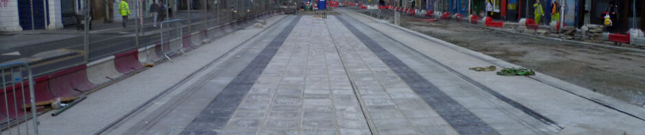 This photo at Balfour Street is looking northeast towards the Newhaven end of the line. Balfour Street (named after the family who once owned the nearby Pilrig Estate) itself is the side street on the left beyond the man in the green hi-vis jacket. The centre overhead line/lighting poles are in place beyond the stop but two remain to be erected on the platform. Once the central street lighting is switched on, the pavement lamp standards are being removed. Platform furniture is still to be installed. On the left we see the no. 16 bus to Colinton via Princes Street which is heading south along what would normally be the northbound lane. All northbound traffic is currently being diverted elsewhere. (Photograph by Roy Calderwood, 4th May 2022)