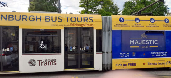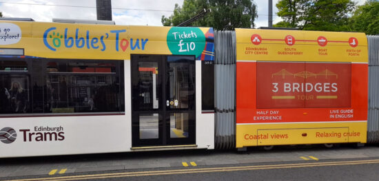 Edinburgh Trams 269 is now bringing a splash of colour to the city as its received new adverts for the Cobbles Tour – a bus tour around the city aimed at a family market – using a bright yellow background making sure that it stands out against the standard fleet livery. The advert was first spotted at the end of May 2022 and replaces a previous advert for Scotland. Let’s do net zero.