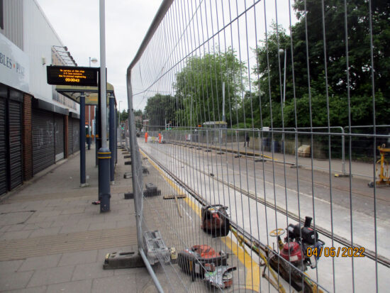 Infirmary Road tramstop where work is underway on replacing the inbound tracks. The passenger information display let’s anyone know – in case they hadn’t notice the big barriers! – that there are no trams running from the stop.