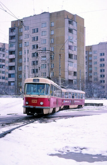 In both of these images we see 822 and 818, both of which were built in 1974, further round the Knyahyni Olhy loop after fresh snowfall. Advertising on trams was still relatively rare and 818 is publicising two separate firms. Enthusiasts who like to ride all the track of a system would have been pleased to find that it was possible to cover the entire track of the loop – and on this occasion a very healthy load of passengers is taking the opportunity to do so!