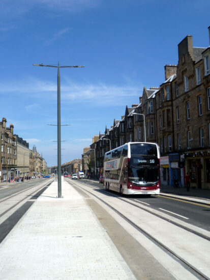 This view looks towards Leith. At this time northbound traffic on the left was still diverted elsewhere but the southbound traffic including buses had less obstacles to concern them. The Lothian bus is making its way to the city centre and then on to Colinton and Torphin. McDonald Road tramstop is just beyond the pedestrian crossing at the first traffic lights whilst the central reservation isn’t always as wide as can be seen here.