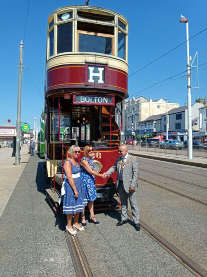 On Friday 12th August the 40 years of operation in Blackpool was celebrated with the Bolton 66 Tramcar Trust (who remain owners of the tram) inviting the Mayor of Bolton, Akhtar Zaman, to travel along the Promenade. He was joined by Kathryn Benson, Mayoress of Blackpool, and her consort for a journey to the Imperial Hotel for afternoon tea. The day ended with a new book launch detailing the history of the tramcar.