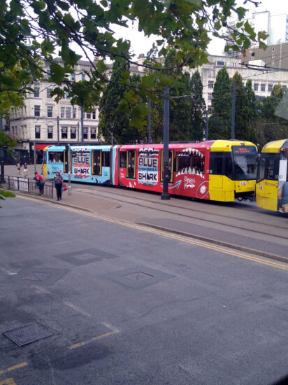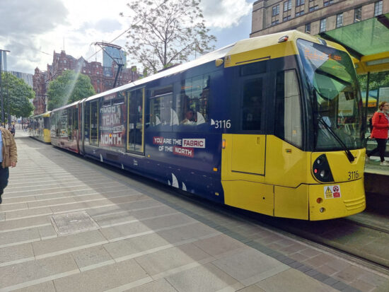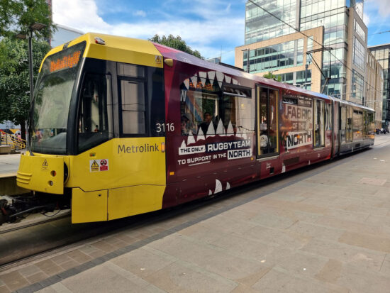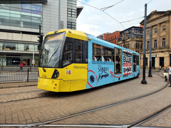 The new vinyl wraps on Manchester Metrolink keep on coming – the latest to be noted out in service is on 3116 with a colourful advert for Sale Sharks (Rugby Union club) having been applied during August.