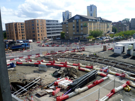 We’re again in the multi-storey car park for this shot which looks southeast over the Holiday Inn Express Edinburgh Waterfront and new flats with the 1960s tower blocks, Citadel Court and Persevere Court beyond. The trackwork in the foreground is for trams to Newhaven which will proceed right. The track for trams heading to the Airport is in the foreground between the lines of red and white barriers, currently delineating the pedestrian route through the works here. (All Photographs by Roy Calderwood, 5th September 2022)