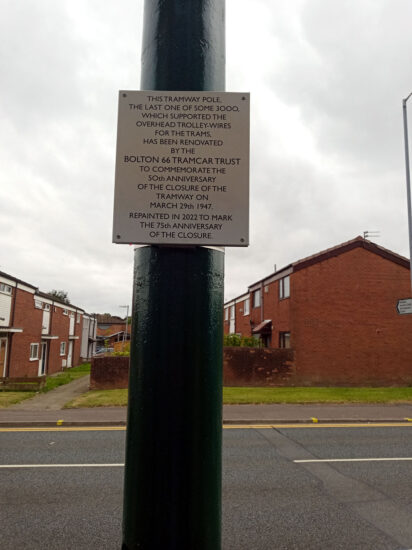 Bolton Corporation Tramways ran electric trams in the Lancashire town between June 1899 and 29th March 1947 with just over 32 miles of track for the extensive network of routes. Operating on standard gauge the tramway utilised the overhead electric system and for this needed some 3,000 overhead support poles. Of these only one remains today at the junction of Halliwell Road and Blackburn Road.