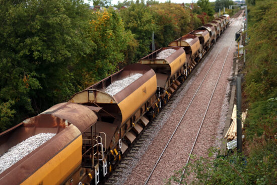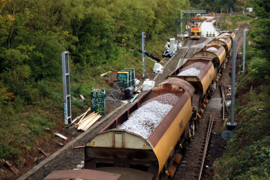 The view from the other side of the road bridge looking towards Hebburn with a Freightliner Class 66 at the head of the ballast train. There is a new crossover in front of the 66 to enable trains to access the Metro lines from the freight line.