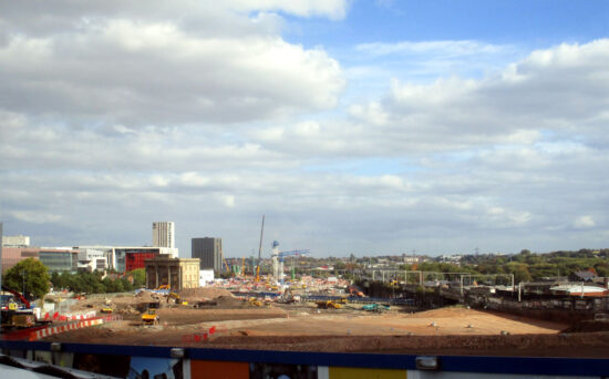 The extension will serve the HS2 station at Curzon Street. This large worksite is where that will be located. The line into Birmingham New Street from Birmingham International is on the right and the original Curzon Street station building is still on situ on the other side of this photo. The tram will cross the site somewhere near Curzon Street before going underneath the railway.