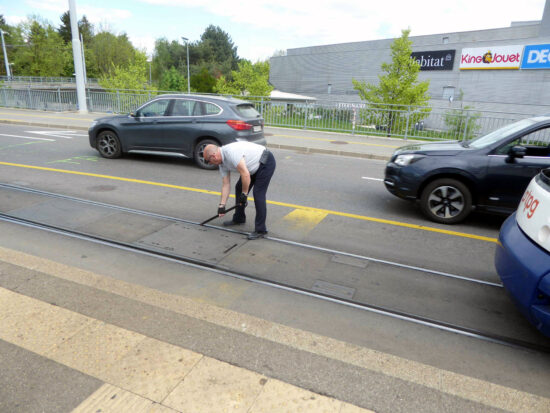 Sometimes not all tramway equipment works as it should which requires a little bit of manual intervention from tram crews or engineers. And that was the case on 26th April 2018 in Geneva when the points at the junction of the routes to CERN and Meyrin Graviere were not working. This meant that every tram had to come to a stop with the driver then having to use a manual points bar to change the points in the direction they wished to go.