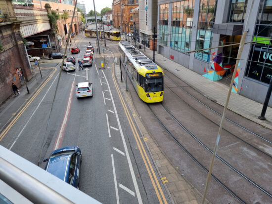 Ideally situated for photos when you’re just heading to Manchester Piccadilly for a train home after a day “on the trams” the bridge which links the station approach to Piccadilly Place is a good location to capture images of trams from above. This photo shows one of the newer M5000s to have entered service – 3144 – as its on the final approach to the undercroft which is where the Piccadilly Metrolink is located.