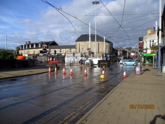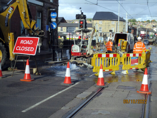 As we mentioned last week, Sunday 9th October saw a revised service on Stagecoach Supertram because of Yorkshire Water works in the Hillsborough area. This meant that all trams on the Blue and Yellow routes were unable to operate any further than Shalesmoor with Supertram tickets valid on local bus routes instead to get to Malin Bridge and Middlewood. Judging by the below images the emergency work was definitely needed as it was a case of a new river through the middle of Hillsborough whilst the repairs were undertaken. Stuart Cooke shows us where the work took place.