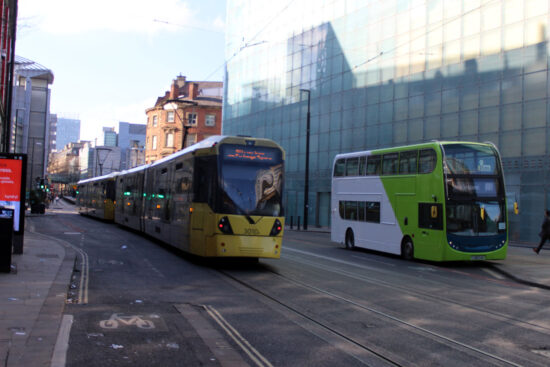 Our “Trams &” series continues today as we again feature a tram alongside a bus – this time in Manchester.