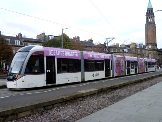 This is the sixth different design to have been applied to 251 since the first for Edinburgh Trams’ Tramspotting promotion in January 2017. Other advertisers have been CR Smith (May 2018-February 2019), Edinburgh Live (February 2019-November 2019), American Express (November 2019-March 2020) and the first St James Quarter (June 2022-October 2022).