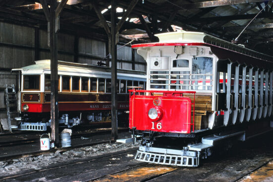 Inside the sheds on this day we see two trams – both of which are in the operational fleet today. Closest to the camera is 1898 built Crossbench 16 whilst across the far side we see Tunnel Car 7 (four years older as it dates from 1894). Of the two cars 7 looks the less recognisable today as it is now in the Blue and Ivory livery whilst 16 is once again in a similar livery style to this having spent some time in green.