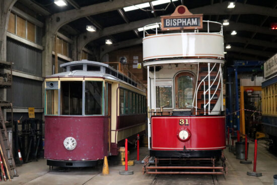 Gateshead 10 inside the depot at Beamish with Blackpool 31 for company alongside. You can still see some evidence of green paint and the crimson of Gateshead is just an undercoat so much more paint attention will follow once other parts of the overhaul have been completed. (Photograph by Trevor Hall, 6th November 2022)