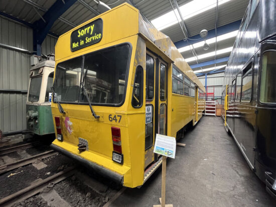 Perhaps the most significant tram historically at NELSAM is Centenary Car 647. The last traditional standard gauge tram built for a UK tramway by East Lancashire Coachbuilders, the tram entered service in Blackpool in 1988 and was withdrawn at the end of traditional tramway operation in 2011. Acquired by the North Eastern Electrical Traction Trust (NEETT) there were plans which would have seen it receive an old school Blackpool tramway livery or red, white and teak but these have not been carried forward.