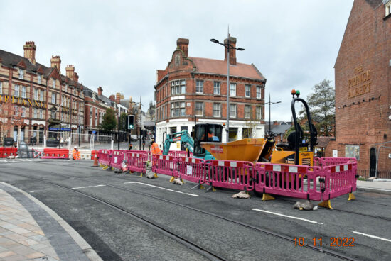 Further works as the tramway turns into Railway Drive – previously completed work has now seen a new trench dug alongside the tracks.