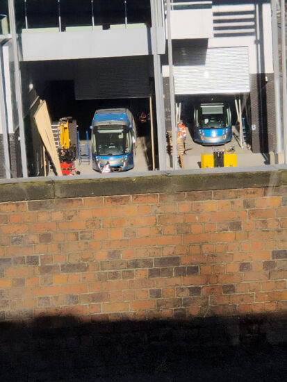 Taken from the top deck of a passing bus (and over a wall) this snapshot shows the two trams within the Very Light Rail Innovation Centre. The tram on the left seems to be being worked on with the front skirt having been lifted. (Photograph by Mark Cufflin, 9th December 2022)