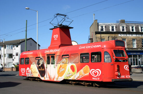 2007 saw 631 receive a new all over advert (and an advert which would last for five years – although that’s still not its longest lived ad!) when it received a bright red design for Walls Ice Cream. With fairly extensive use of contravision the advert promoted a number of different Walls products include Cornetto, Magnum and Solero. We see the tram standing on Bold Street, Fleetwood having just terminated, judging by is position there are other trams up ahead. The date was 4th September 2007.